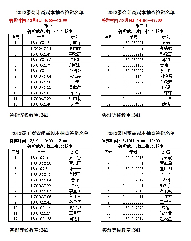 学院定于2017年12月9日(周六)进行2013级高起本班毕业生论文抽查答辩,现公布毕业生论文抽查答辩名单(见附件)和答辩具体安排。请各位同学认真准备,按时参加抽查答辩。不按时参加抽查答辩的同学论文成绩下调一档(一档为10分),学院不再安排论文补答辩。