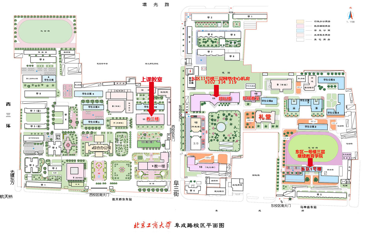 注:继续教育学院办公室位于东校区1号楼三层,西校区教三楼为学生上课主要教学楼,计算机文化基础上机实验室位于东区耕耘楼(东区11号楼)三层。课表标记西3XX,第一位3表示教室位于西校区教三楼,第二位为楼层数,第三位为教室号;课表标记东11-9XXX机房,表示上机实验教室位于东校区11号楼(耕耘楼)三层。